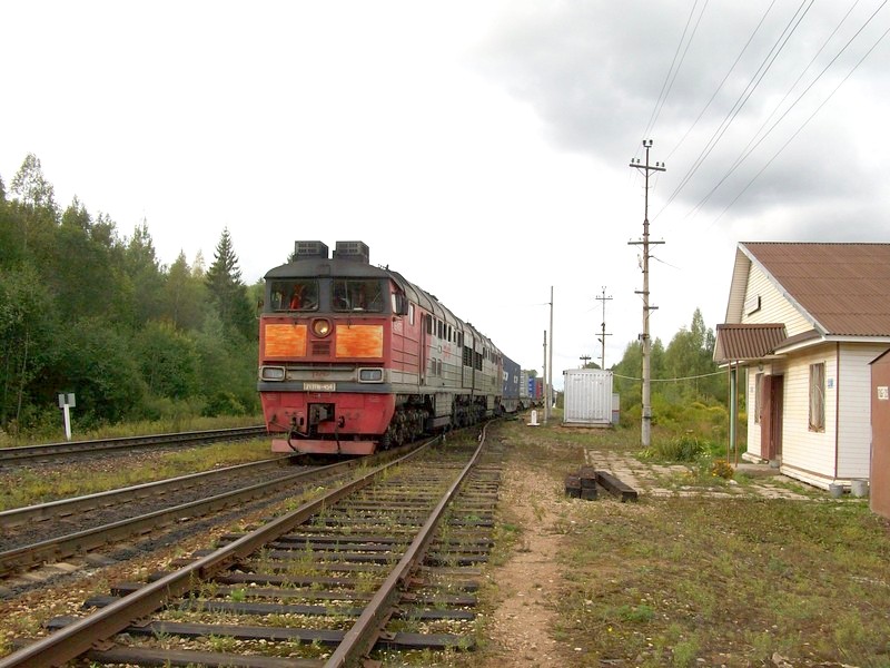 Разъезд Подсосенка. Тепловоз 2ТЭ116-454 ведёт грузовой поезд в сторону Ржева. Время 12:45.