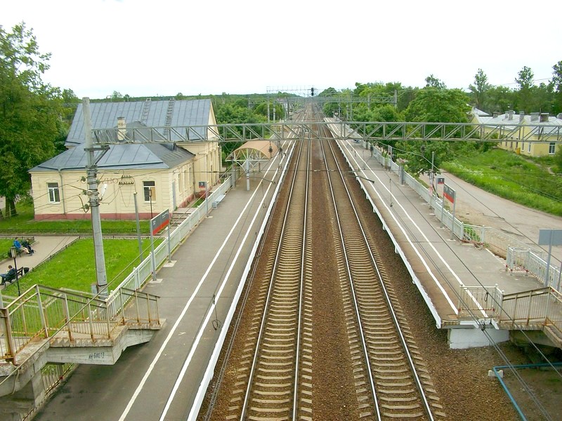 Станция Саблино. Вид в сторону Москвы. Слева — вокзал. Третий путь (линия здесь трёхпутная)