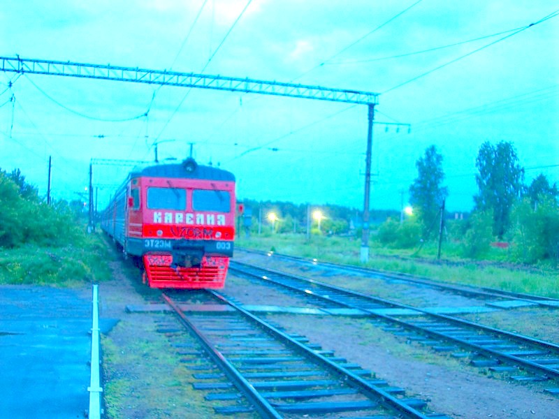 Электропоезд ЭТ2-018 на станции Ладожское Озеро. Время 5:56.