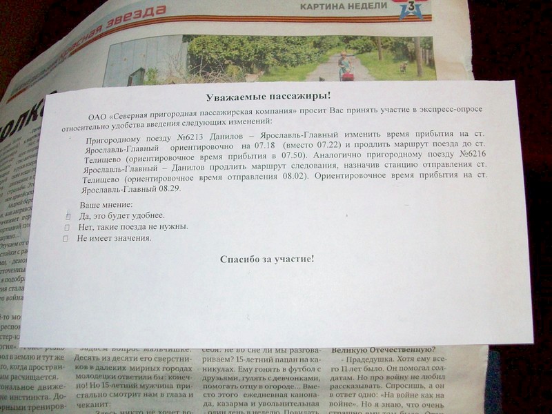 Опрос Северной ППК в поезде Ярославль — Данилов. Такие бумажки выдаются всем пассажирам