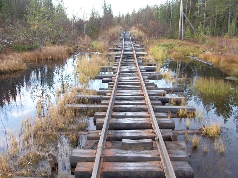 Белоручейская узкоколейная железная дорога. Участок пути, проложенный по болоту.
