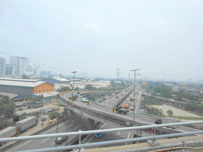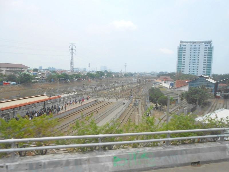Вид на Джакарту со скоростной автомагистрали. Железная дорога на Тангеранг. Время 12:05.