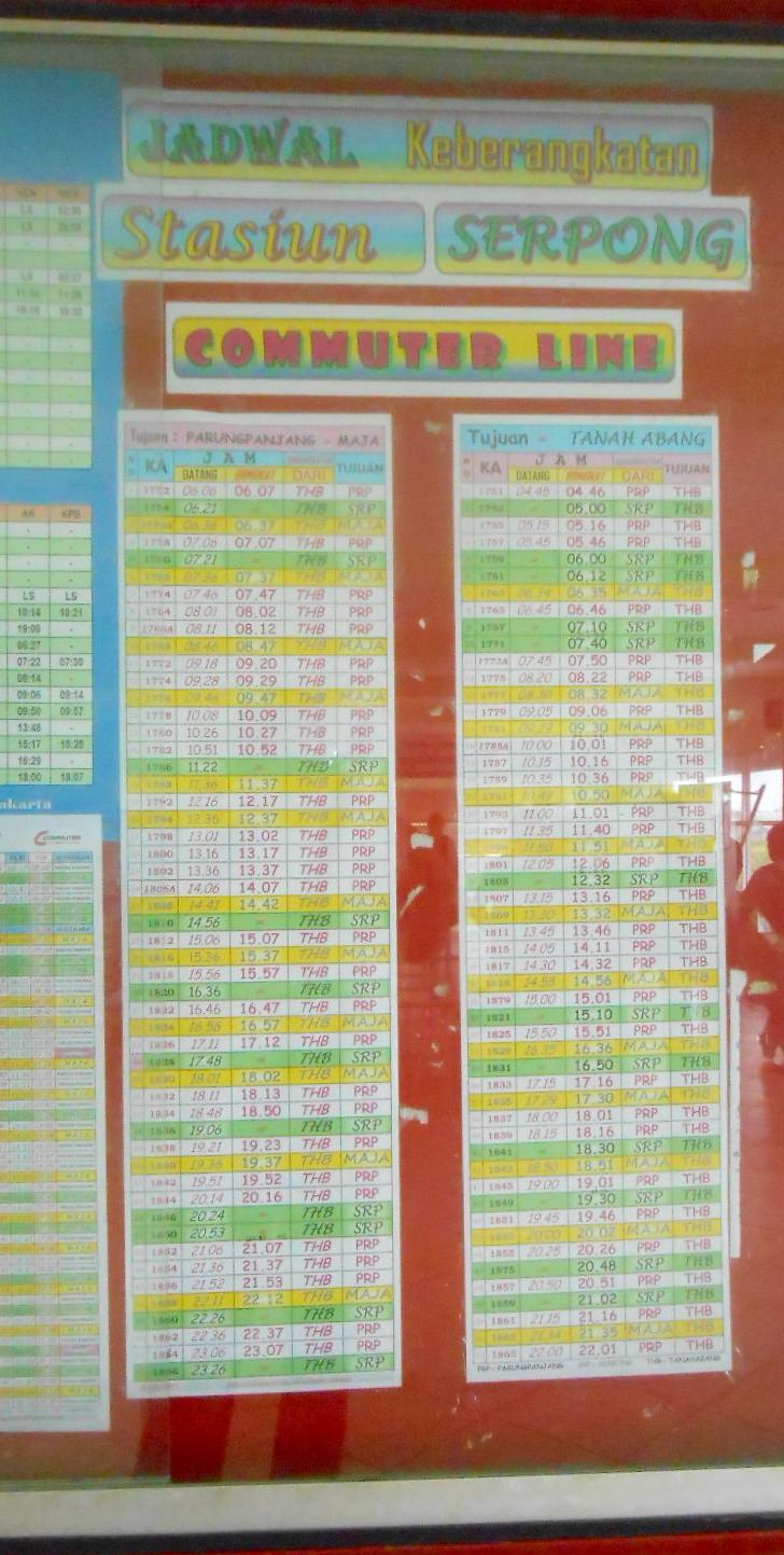 Расписание движения электропоездов, вывешенное на станции Серпонг. Пункты движения обозначены