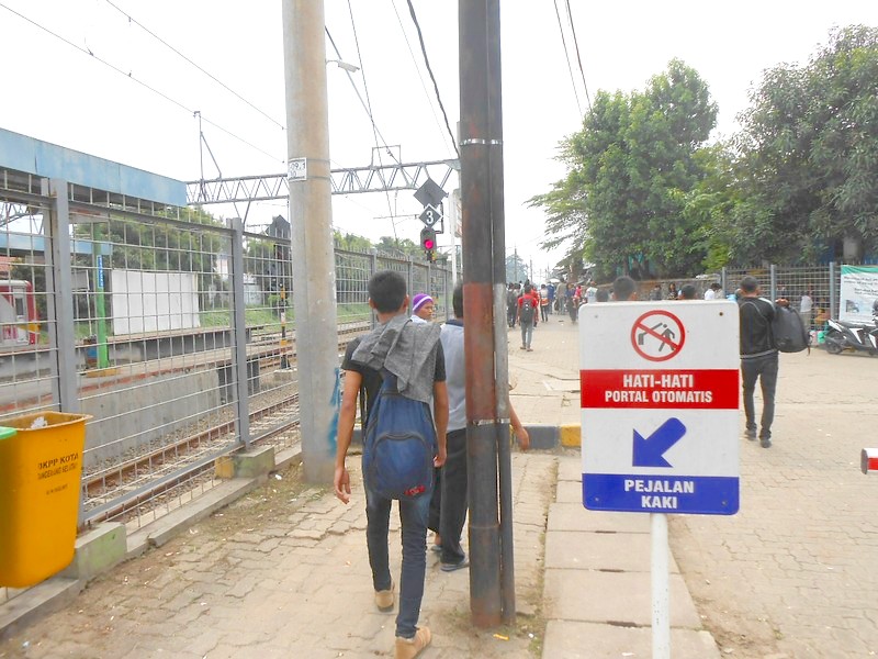 У станции Серпонг. Надписи на плакате справа: «Осторожно, автоматический шлагбаум!», «Пешеходный проход». Время 14:17.