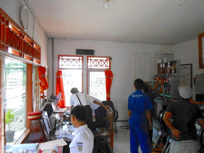 Пути станции Прабумулих. Здесь традиционные автоматические стрелочные переводы, в отличие от Лубук Линггау. Время 9:00.