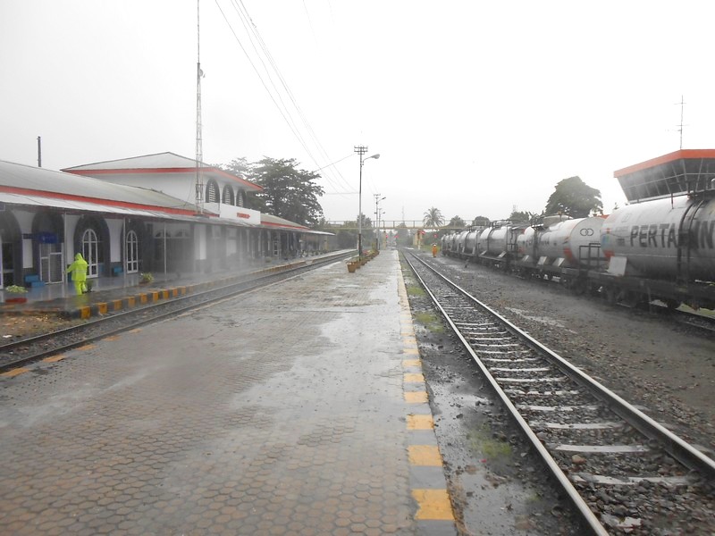 Станция Прабумулих. Вид в сторону Кертапати. Слева — вокзал. Время 9:06.