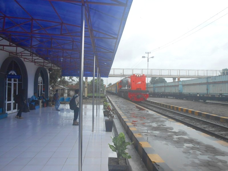 Станция Прабумулих. С опозданием на 50 минут прибывает поезд «Rajabasa»