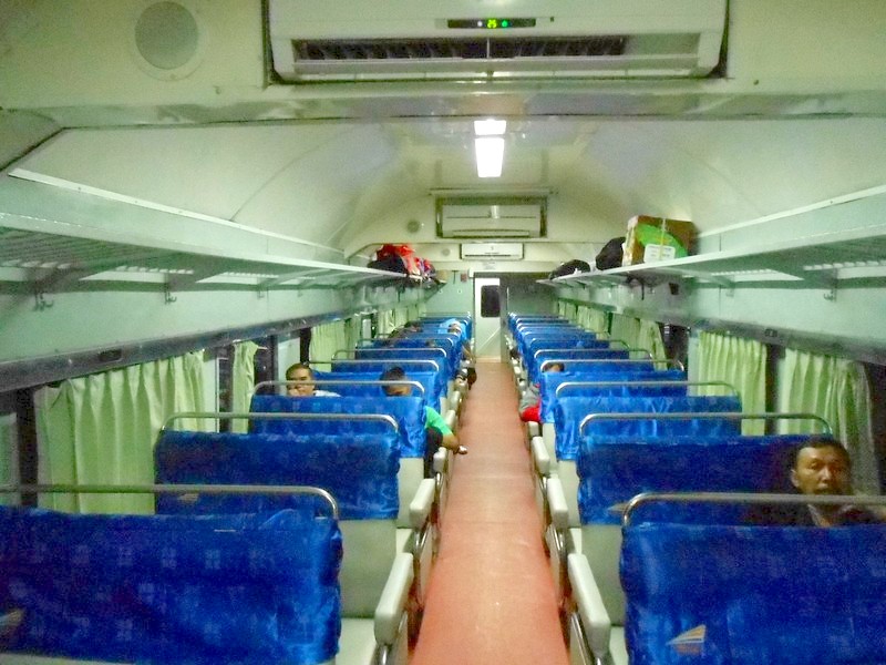 Мой вагон — естественно, самый дешёвый из возможных. Сидячий, кондиционируемый. Неудобно, так как заполненность стопроцентная. Компоновка сидений — как в дешёвых поездах Таиланда. Отличие в том, что дешёвые вагоны железной дороги Таиланда — некондиционируемые.