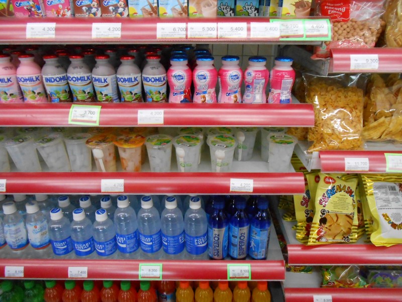 Продукты в стандартном магазине «Indomaret» на вокзале. Время 16:50.
