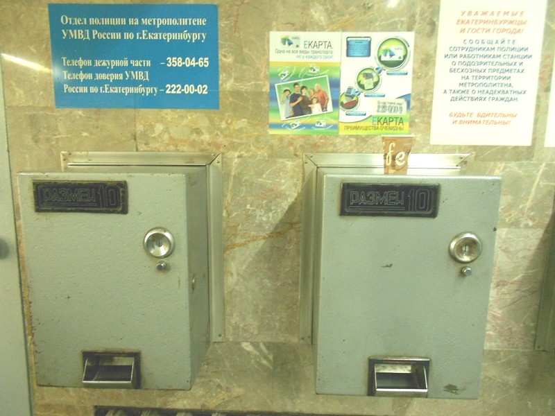 Станция «Уральская» Екатеринбургского метрополитена. Остались недействующие разменные автоматы эпохи СССР.