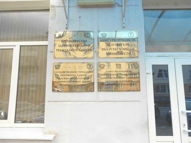 Майкоп. Двуязычные таблички на здании, где размещаются государственные учреждения.