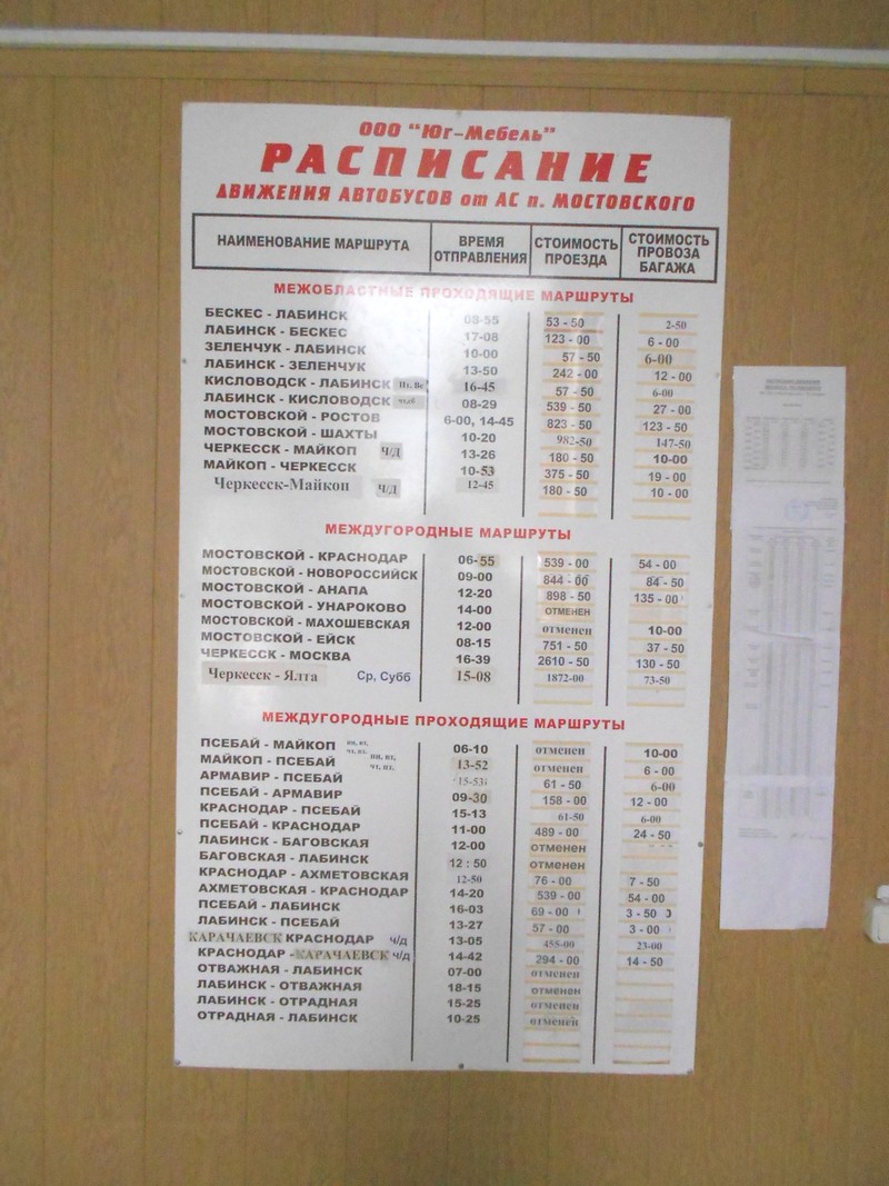 Расписание по автостанции посёлка Мостовской.