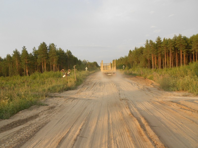 От понтонного моста до Харитоново — подвёз водитель лесовоза, следовавший на лесовозную дорогу у Сойги. Движение на участке Рябово — Литвино открылось только в 2011 году. Дорога — дурная грунтовка. Срок службы лесовозного КамАЗа, по словам водителя, тут составляет пять лет. У импортной машины чуть больше.