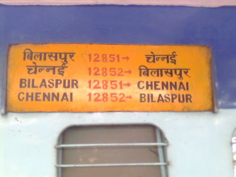 Маршрутная доска на вагоне поезда Биласпур — Ченнай (Мадрас).