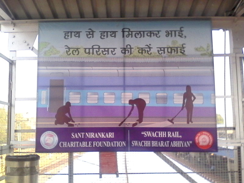 Станция Raipur junction. Призыв поддерживать чистоту содержит слова из хинди, записанные латиницей.