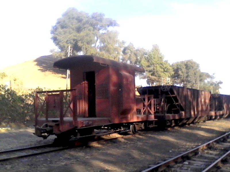 Служебный вагон (кэбуз) и грузовые вагоны на станции Kalakund. Назначение — сервисное, подсыпка балласта.