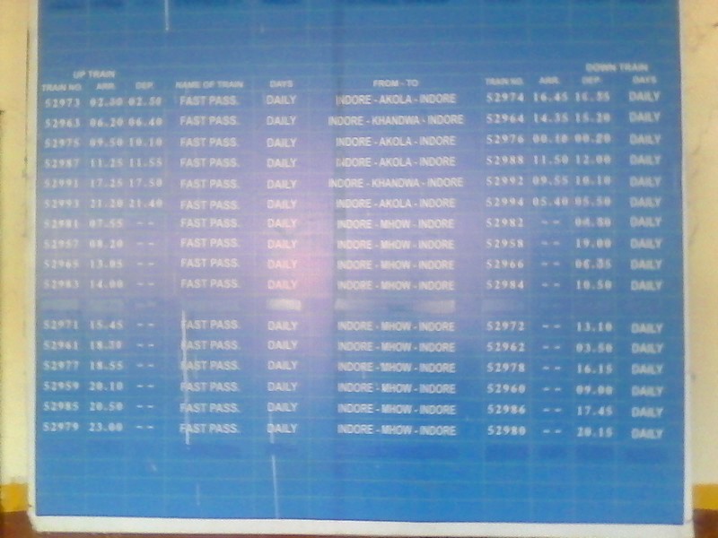 Станция Mhow. Расписание движения поездов. На Индор в действительности поезда отменены.
