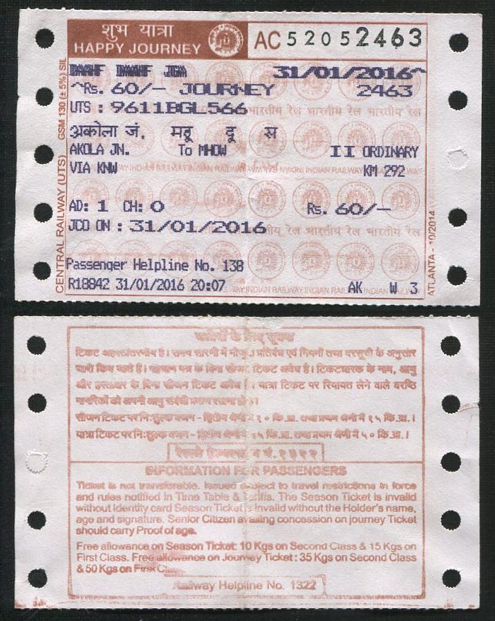 Билет Акола — Мхоу. Расстояние — 292 километра, всё это — колея 1000 мм.