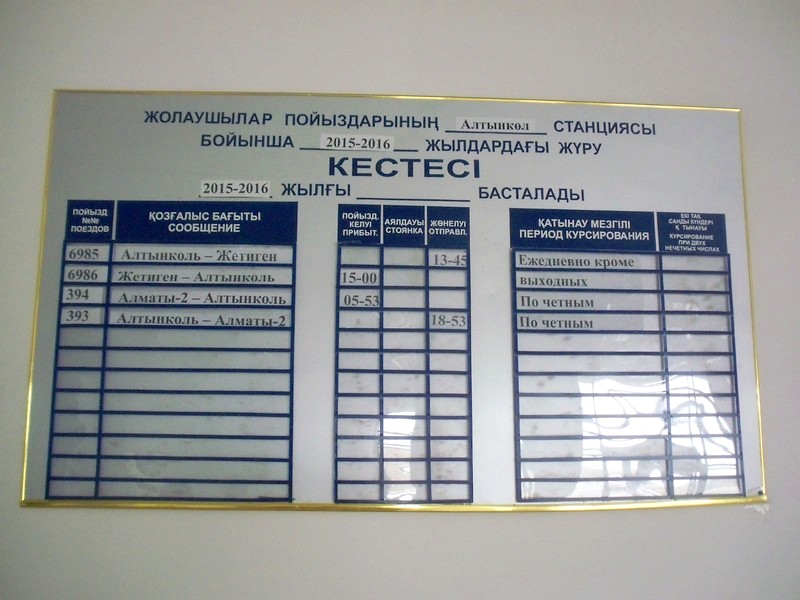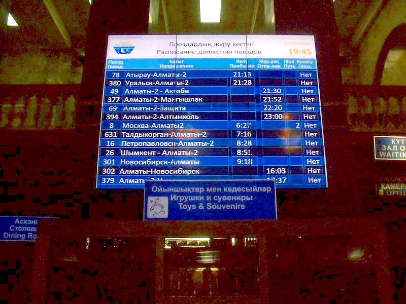 Вокзал Алма-Ата II. Табло с отображением ближайших поездов. Время 19:44.