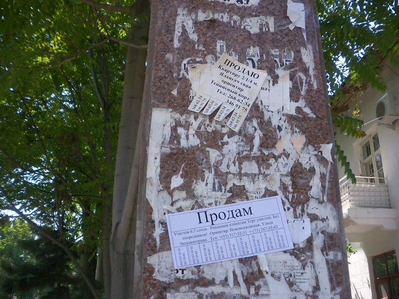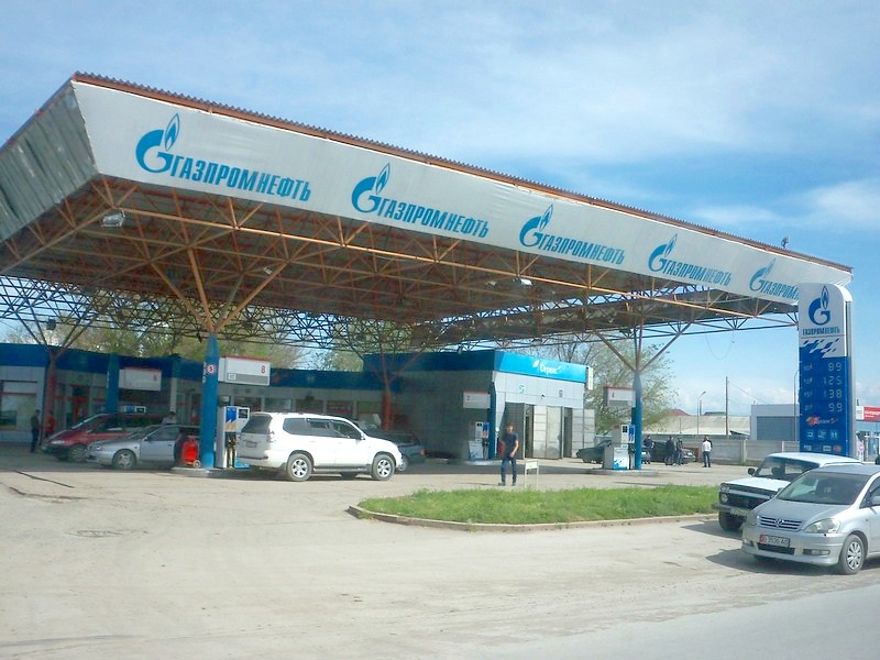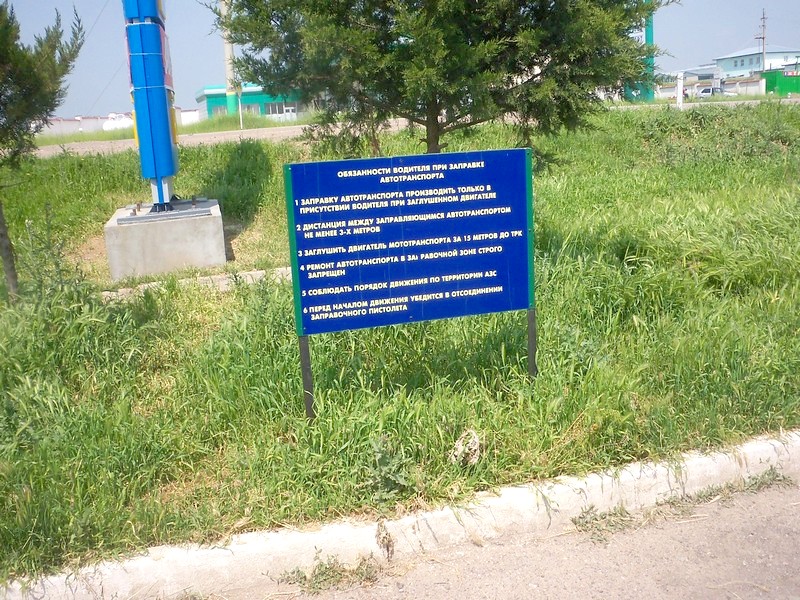 Сарыагач, объявление у АЗС. Русский язык здесь преобладает.