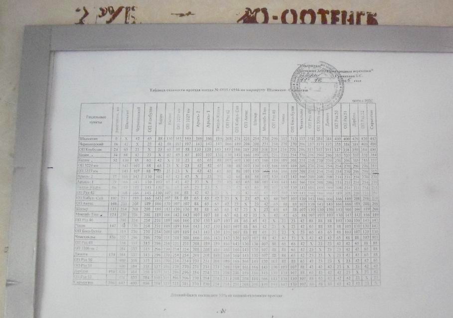 Билет Чимкент - Сарыагач на бланке дальнего следования. Для перевода в рубли нужно делить на пять.