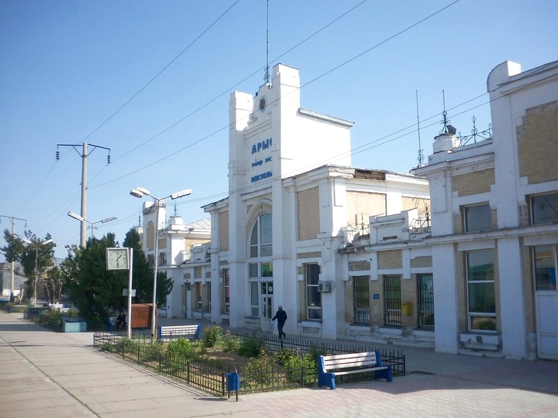 Электропоезд прибывает на узловую станцию Арысь. Время 9:50.