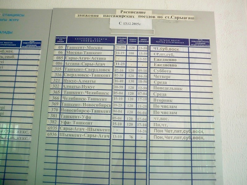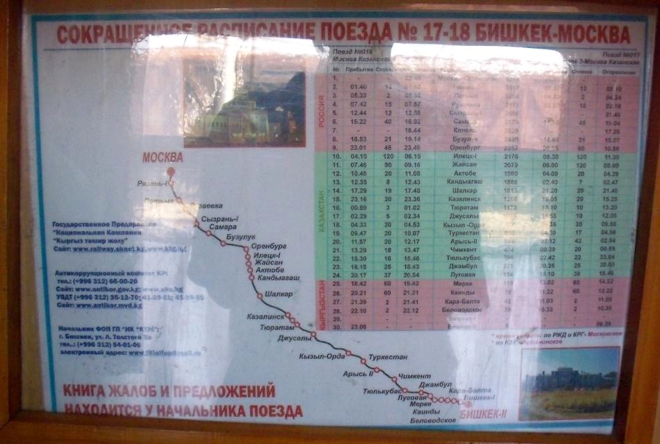 Расписание движения поезда Бишкек - Москва, вывешенное в вагоне.