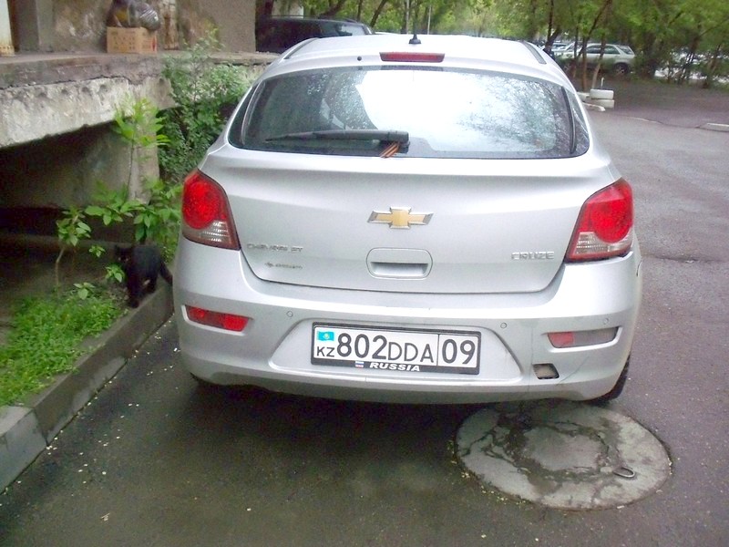 Автомобиль с номерами Карагандинской области, владелец которого не побоялся выставить надпись "Россия" и Георгиевскую ленту.