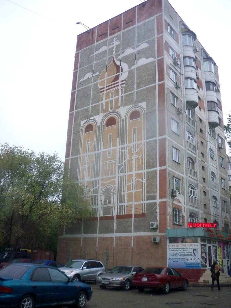 На этом доме 1970-х годов постройки изображён храм Покрова на Нерли под Владимиром. Подписи нет - каждый