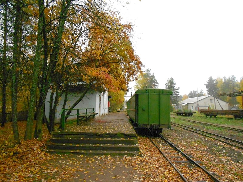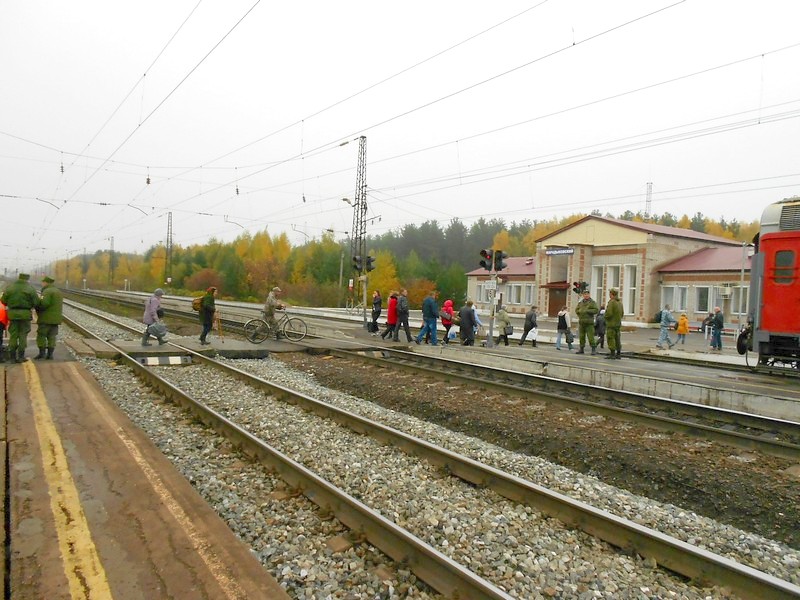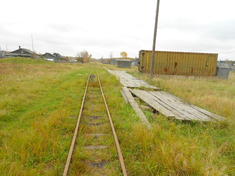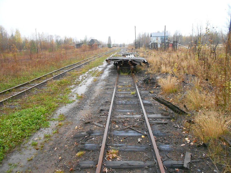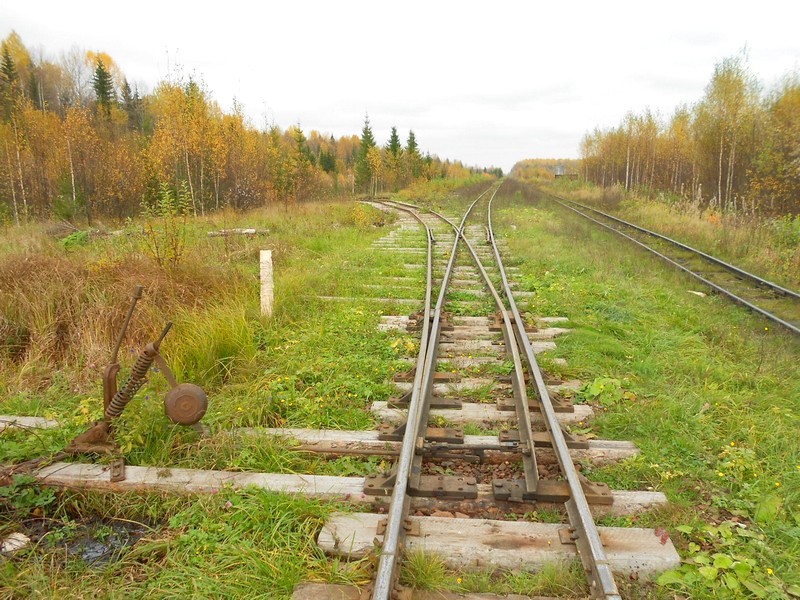 Выхожу на станции Комсомольский, посёлок Октябрьский. Октябрьская узкоколейная железная дорога полностью разобрана. Она была огромной, с ветвями сто километров. Ещё в мае 2015 года (!) работала по всей длине и вывозила лес.