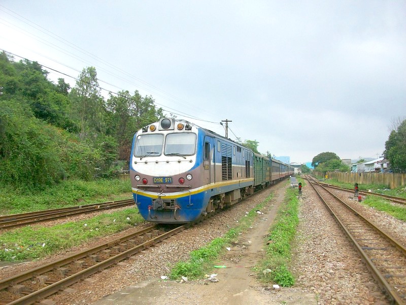 Станция Диеучи. Тепловоз D19E-971 ведёт пассажирский поезд в сторону Сайгона. Время 13:28.