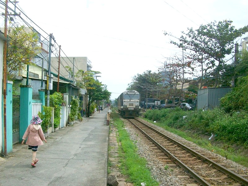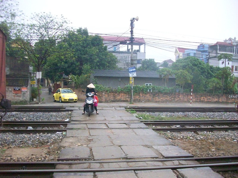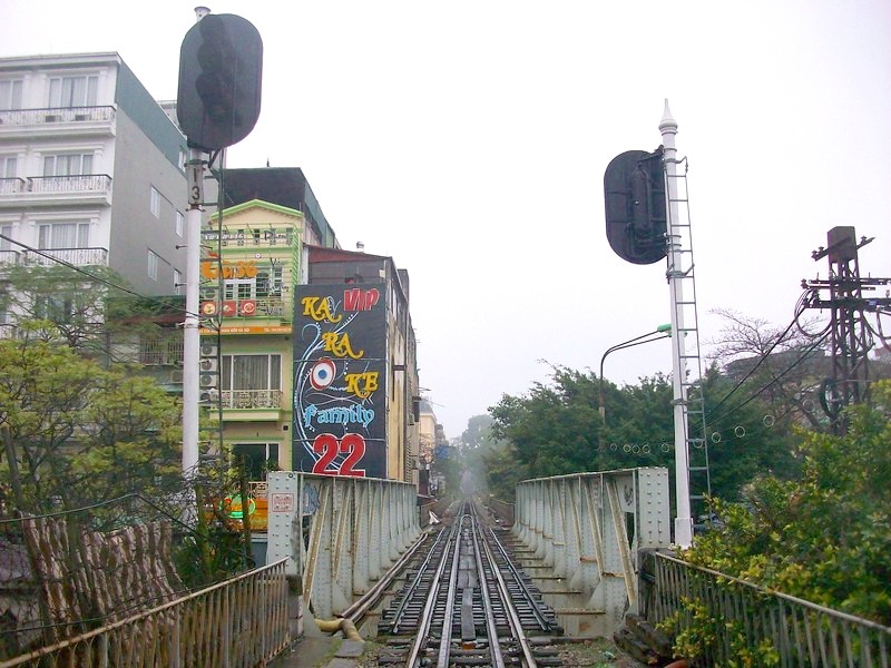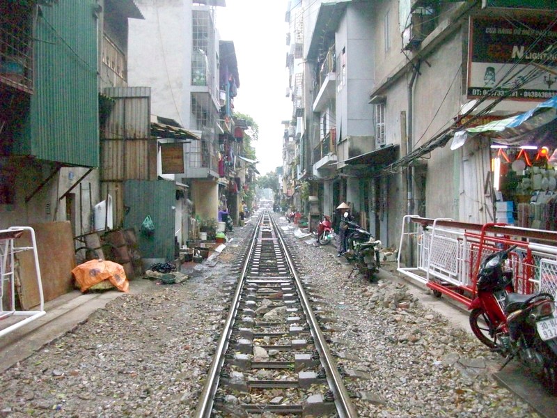 На двухкилометровом участке от главной станции Ханой до «северного вокзала» Long Bien железная дорога проходит в тесной городской застройке. Местами такой тесной, что железная дорога едва заметна в лабиринте жилых зданий. Крыши домов над ней почти смыкаются. Местами удивительно, как вагоны не разрушают эти хлипкие стенки. А ещё почти впритык к рельсам стоят мотоциклы, и прямо на рельсах в изобилии сидят люди, местами на рельсах разложен товар.
