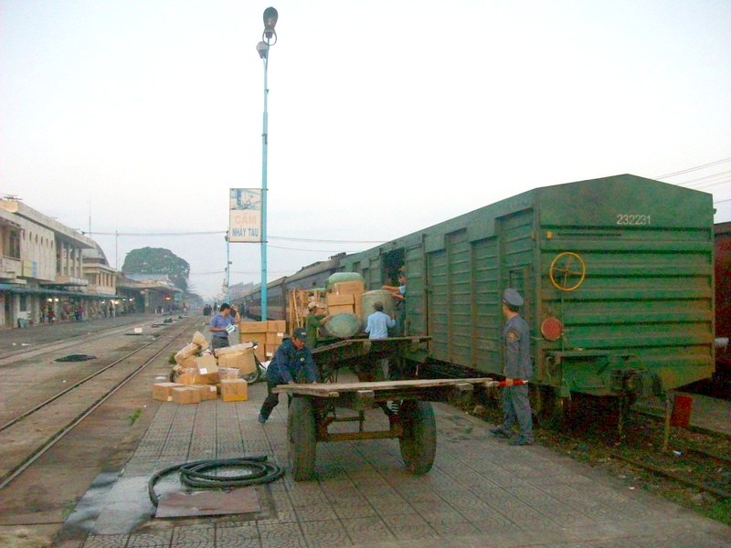 Станция Дананг. Загрузка багажного вагона в пассажирском поезде. Время 6:12.