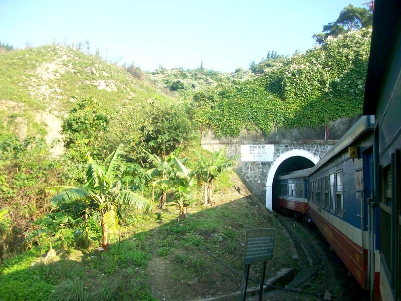 Поезд входит в тоннель на 765/766 км от Ханоя. Длина тоннеля составляет 594 метра. Время 7:41.