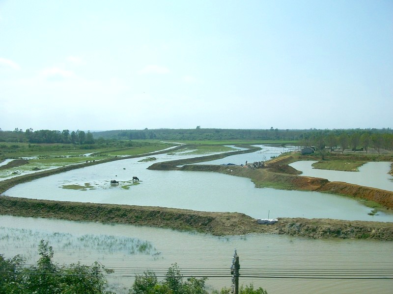 Вид из вагона. Залитые водой рисовые поля. Когда-то, вероятно, это была