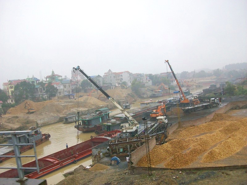 К северу от Trung Gia. Разгрузка барж со стройматериалом. Время 9:33.