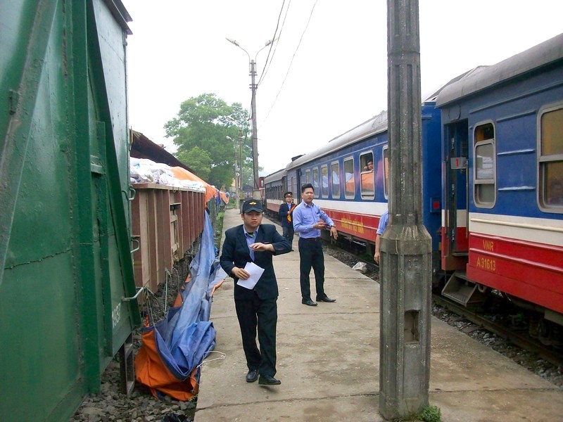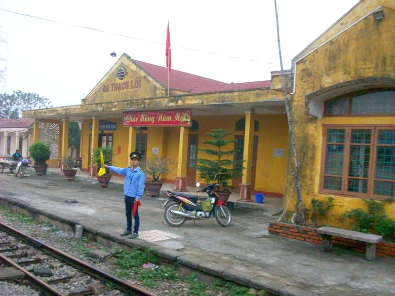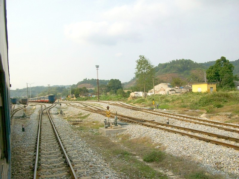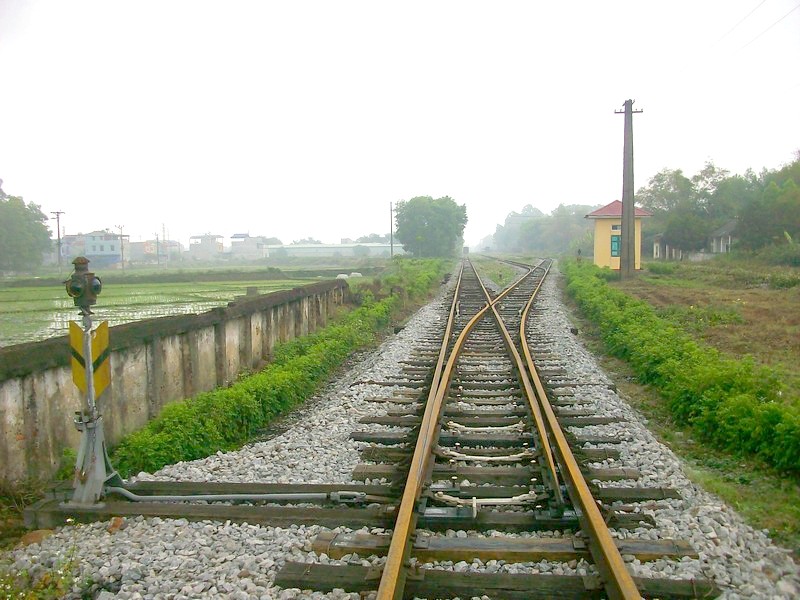 Здесь — трёхниточный путь, 1435 мм/1000 мм. Дальше в сторону тупиковой станции Халонг будет уже только 1435 мм.
