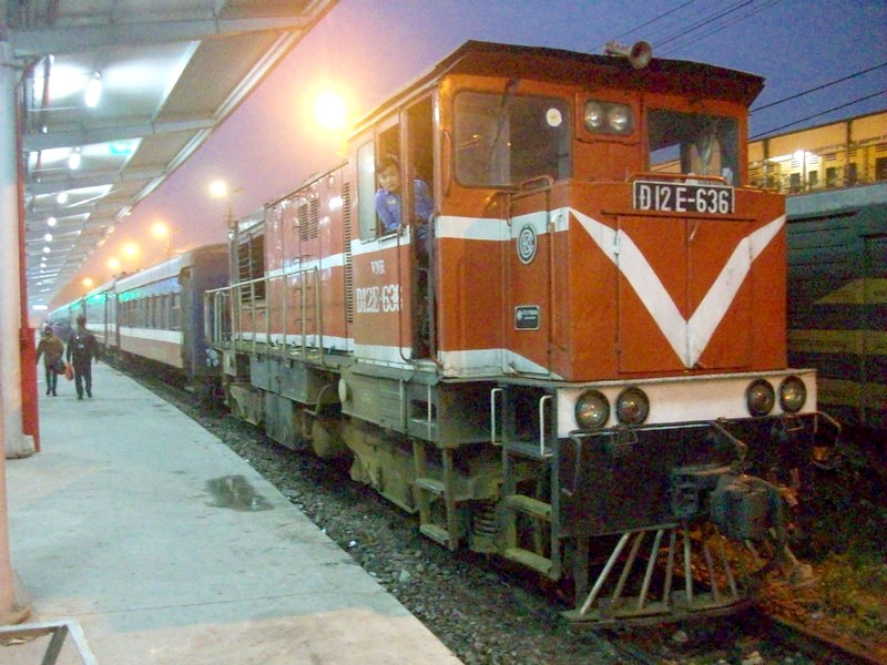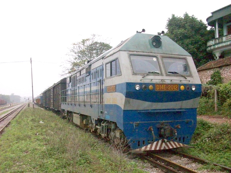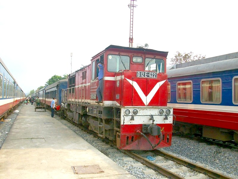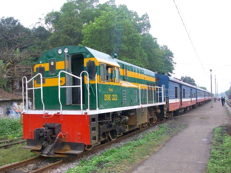 Станция Quan Trieu. Тепловоз D9E-222 с поездом на Ханой (Лонг Бьен). Аббревитуара Железных дорог Вьетнама