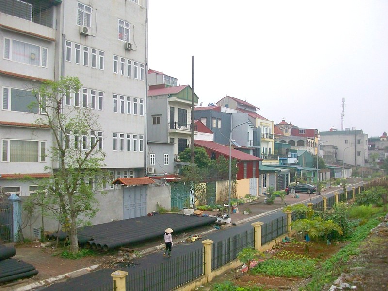 Местность у железной дороги. Для Вьетнама характерны высокие и узкие дома. Время 8:02.