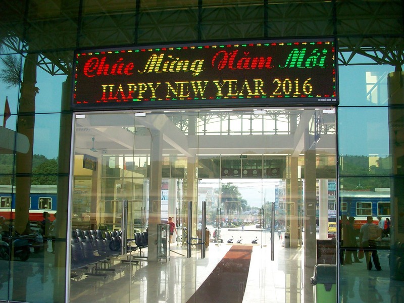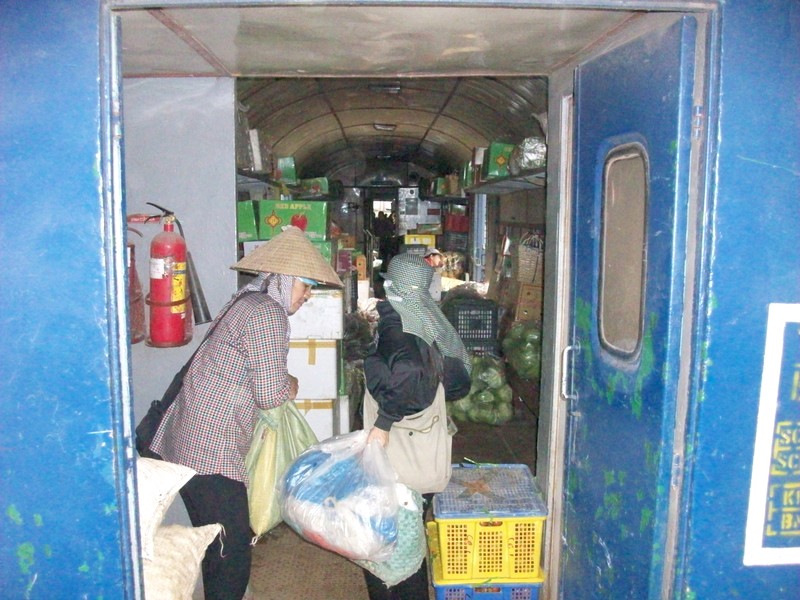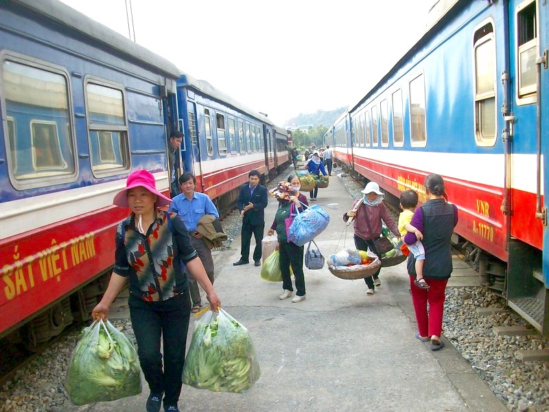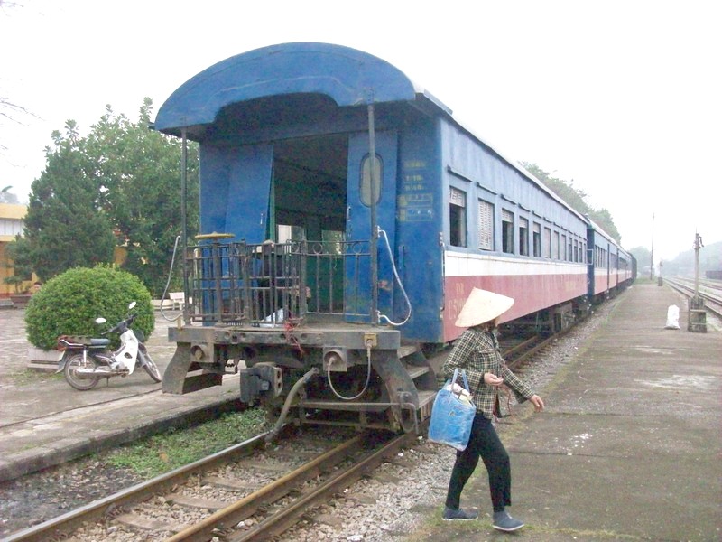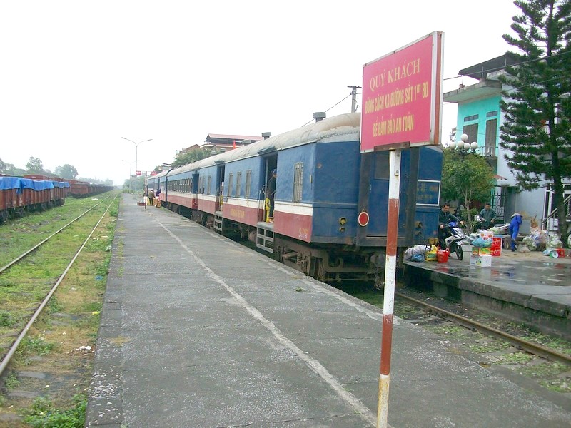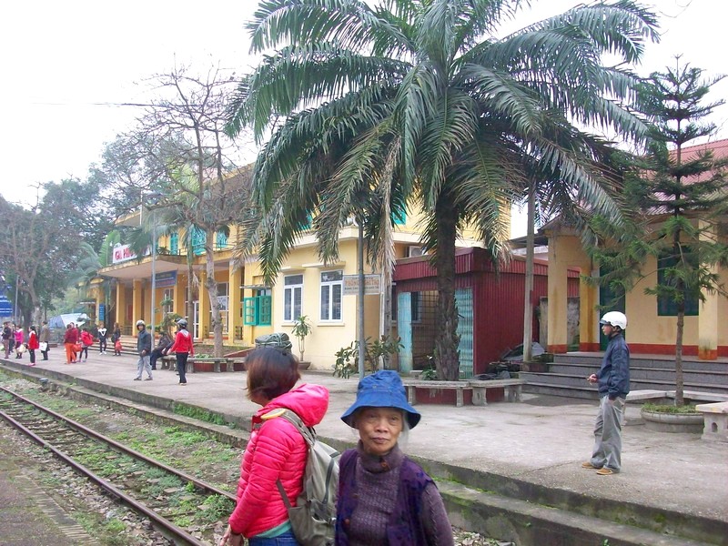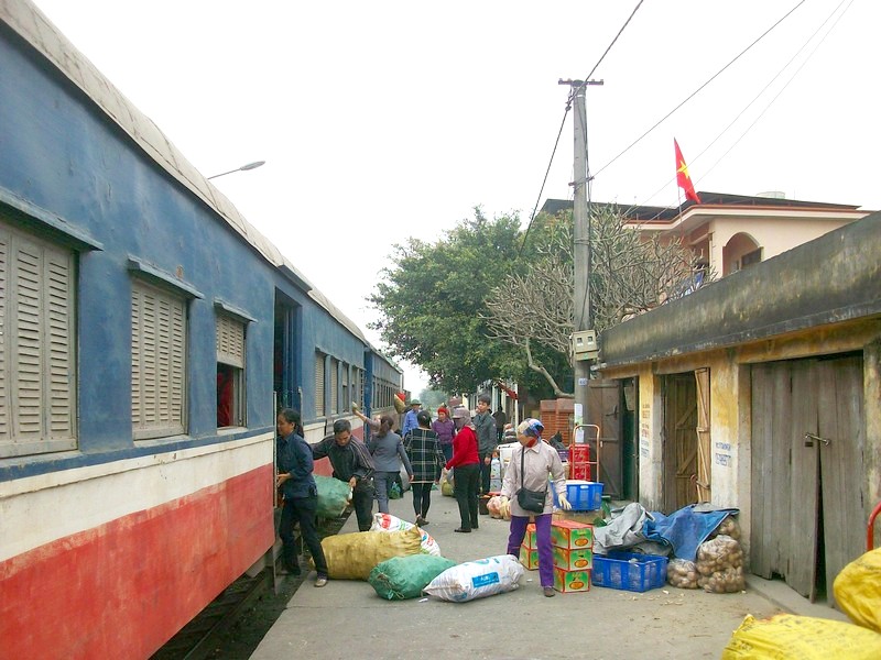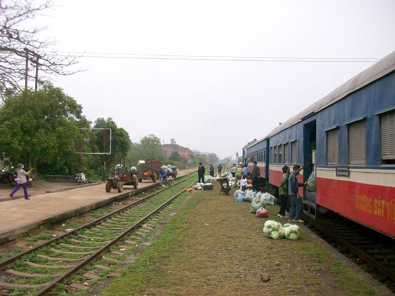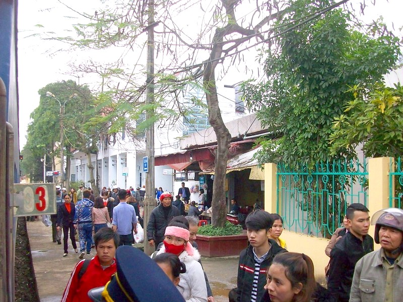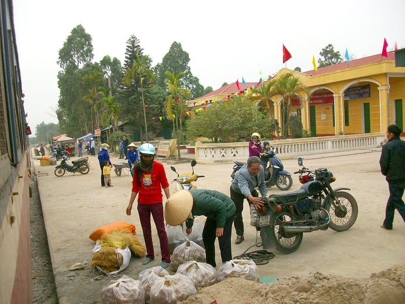 Движемся по тупиковой линии. Поезд имеет непривычно длительные для Вьетнама стоянки. Почти пустой в столице, здесь он заполняется людьми и всевозможным грузом.