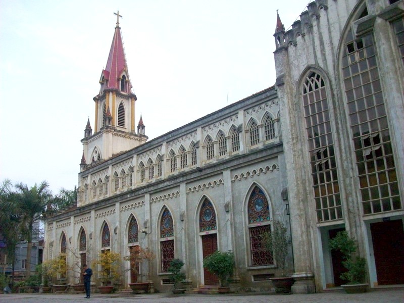 Католический собор в правобережной части города Лаокай. Время 17:32.