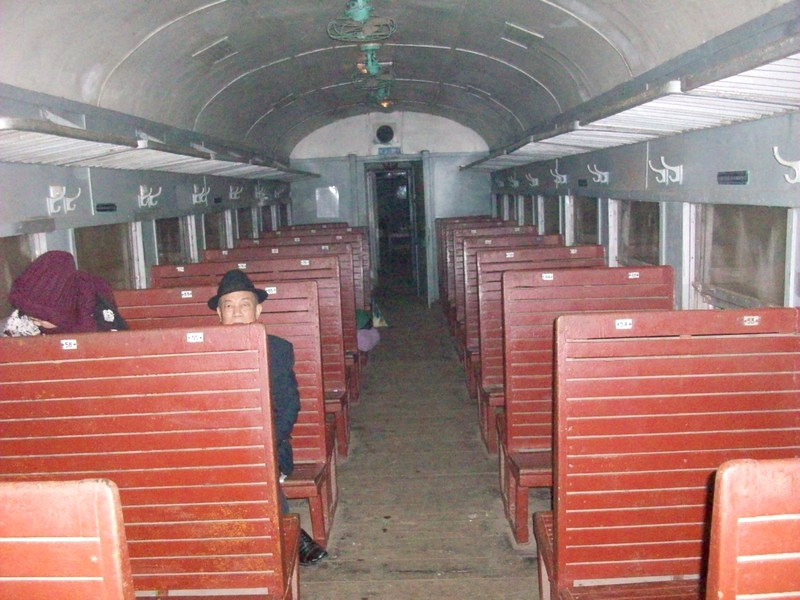 Поезд следует по колее 1435 мм, хотя и является внутренним. Несколько «древних» и «убитых» пассажирских вагонов. Одни — с деревянными лавками, другие являют собой пустое пространство, сиденья демонтированы. Туда затащат мешки или ящики с грузом. У нас такое когда-то было в пригородных поездах локомотивной тяги Дербент — Самур — Граница и в электропоездах Тбилиси — Боржоми. Кроме пассажирских вагонов, есть и грузовые вагоны. Пассажиров — меньше десятка.