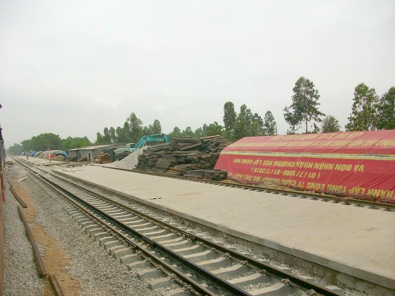 На станции Dong Trieu замечаю следы реконструкции. Самое удивительное, что в ходе реконструкции укладывают трёхниточный путь. К колее 1435 мм собираются добавить «национальную» колею 1000 мм. Большинство стран мира отказывается от узкой колеи, а Вьетнам делать это не намерен.