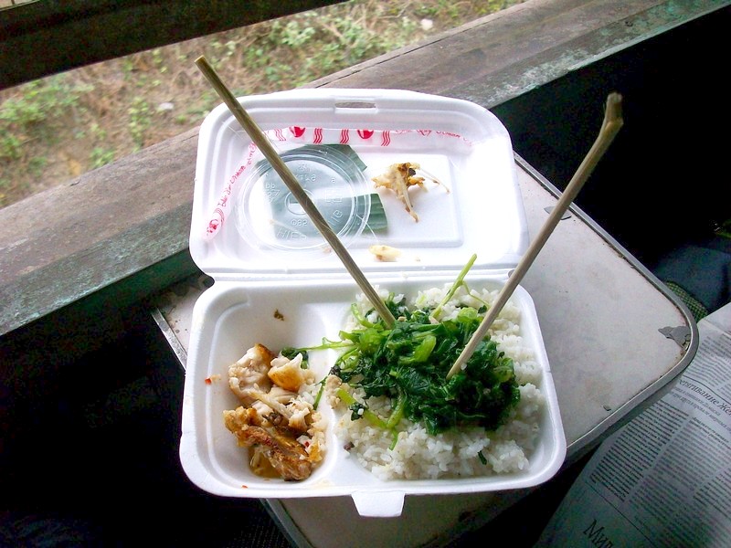 Станция Mao Khe, где поезд долго стоит. Покупаю еду — 25 донг (дали сдачу 5 с 30). Рис, немного зелени, немного рыбы, выпечка. Недорого и без обмана. Места тут не туристические, и в этом поезде туристы — большая редкость. Женщина в поезде, увидев, с каким трудом я ем палочками, дала ложку.
