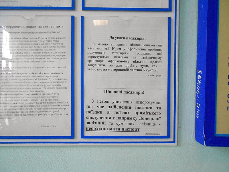 Объявление сверху - из короткого временного отрезка с марта 2014 года по 28 декабря того же года, когда Россия уже оккупировала Крым, но поезда туда ещё ходили.