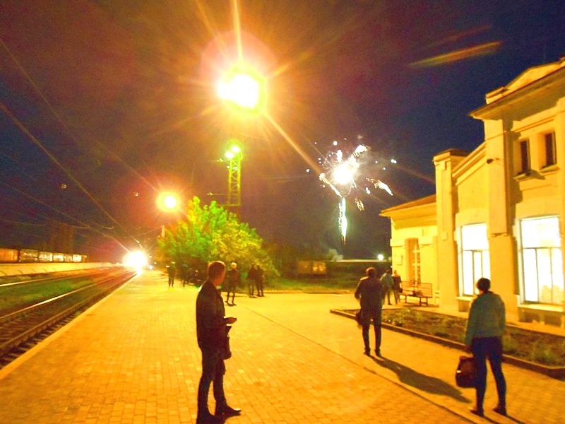 Станция Змиёв. Вскоре прибудет поезд Константиновка - Киев. Салют - не по официальному поводу, какой-то местный житель бурно праздновал какое-то своё событие.