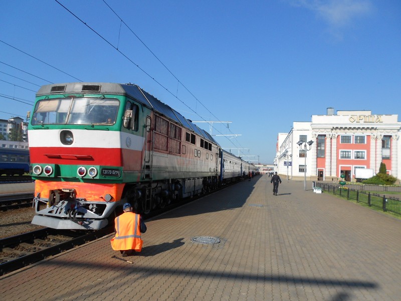 Поезд Брест - Витебск весь маршрут проходит с одним локомотивом - ТЭП70-0214.