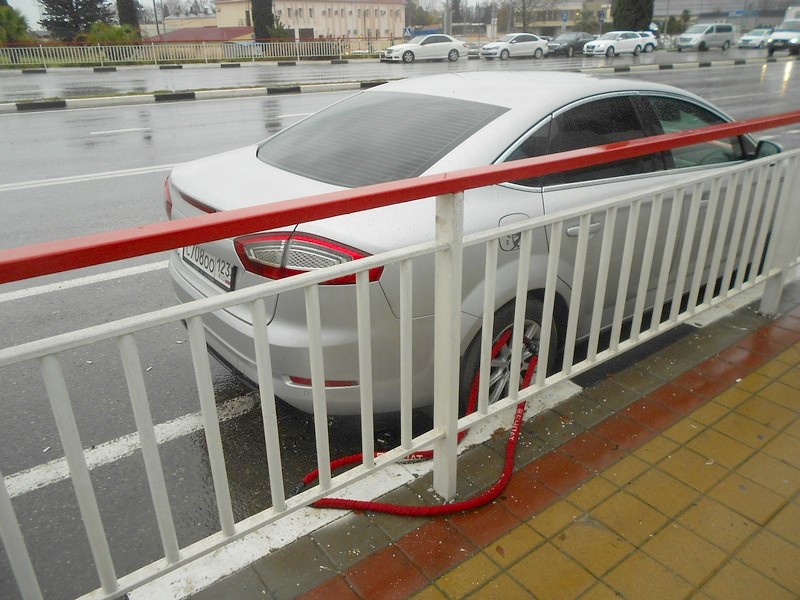 Автомобиль "пристёгнут" к забору, как обычно пристёгивают велосипеды.