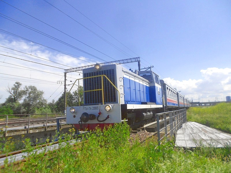 Тепловоз ТУ7А-2886 приводит поезд на станцию Молодёжная.