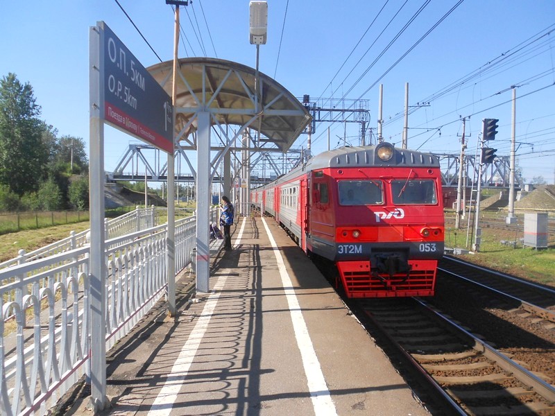 Электропоезд ЭТ2М-053 прибывает к платформе 5 км. Открываются только первые двери первого вагона.